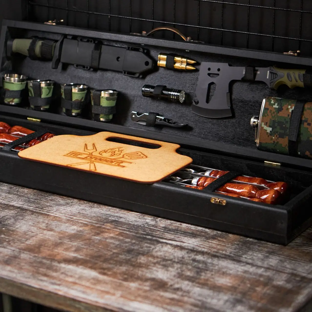 Как оформлен набор? Подарочный набор шампуров оформлен в стильном, презентабельном кейсе. Каждый предмет в кейсе надежно зафиксирован, имеет свое место. Кейс изготовлен в черном цвете, из натурального дерева. Он плотно закрывается, благодаря двум замкам, его удобно переносить за счет металлической ручки.